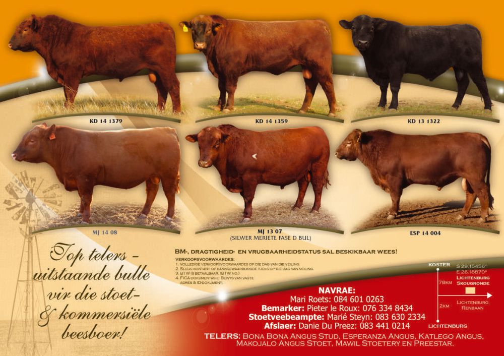 This magnificent bull speaks of the result of thorough breeding with sound genetics. Bull 1307 was born on 25 December 2013 and bred at Bona Bona Angus Stud. Close monitoring of his performance from a young age, indicated that this prestigious animal would perform above average. The sire of this record breaking bull namely Mequatling Fresh, was bought in 2012 on the annual Mequatling production auction. His dam, JMS 06287, was acquired from Angus Alliance, also in 2012. MJ Ernst is of opinion that this bull performed so well on auction due to the balance between his strong physical characteristics and exceptional reproduction values. Bona Bona is proud to be a member of the SA Angus Society and would like to congratulate Mr Willem Grobbelaar from Ottosdal with the solid investment he made in acquiring top genetics from Bona Bona Angus Stud.
